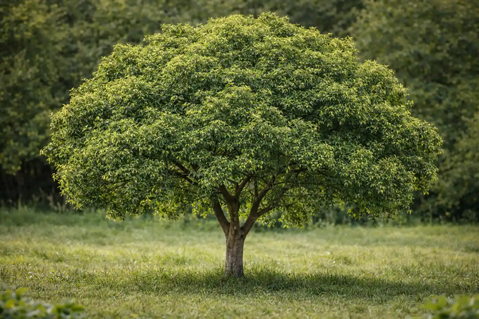 Pianta di canfora vista da una diversa prospettiva, con fusto centrale e chioma compatta di foglie verde intenso, immersa in un prato naturale con alberi sullo sfondo.